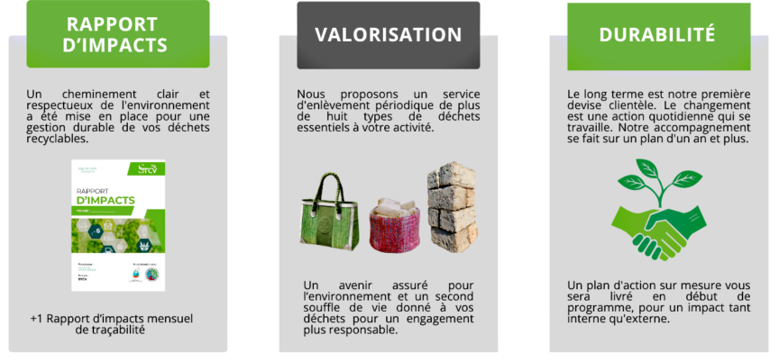 Offre LightL’Offre Light correspond à notre service de collecte destiné aux entreprises industrielles et commerciales souhaitant assumer leur responsabilité en matière de gestion des déchets. Elle comprend la collecte périodique de vos déchets recyclables et, en retour, nous vous fournissons un rapport mensuel d’impacts pour traçabilité, détaillant votre contribution à la réduction de l’empreinte carbone. Rejoignez-nous pour une gestion responsable de vos déchets industriels !